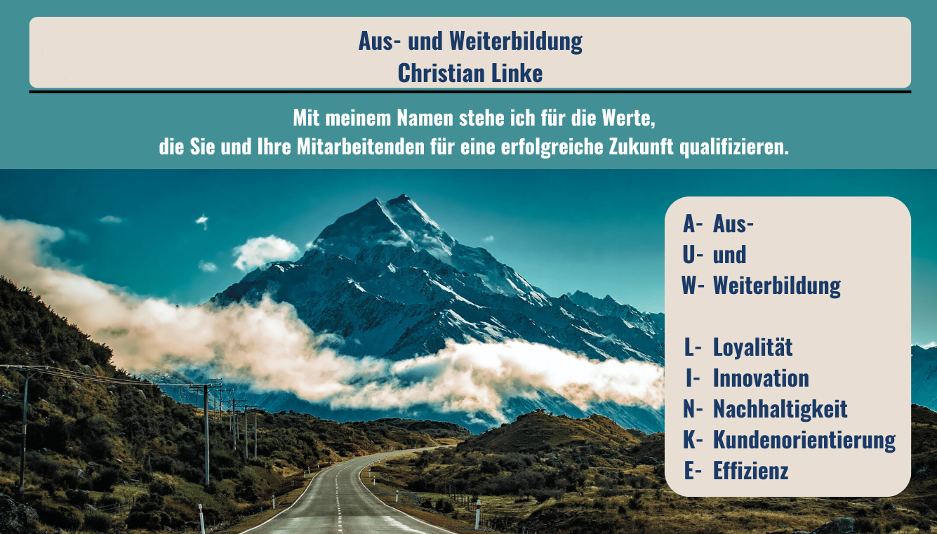 Mit meinem Unternehmen „Aus- und Weiterbildung Christian Linke“ habe ich mich einem Bildungsauftrag verschrieben, der mir sowohl auf Grund meines beruflichen Werdegangs als auch als Privatperson und Verkehrsteilnehmer am Herzen liegt.